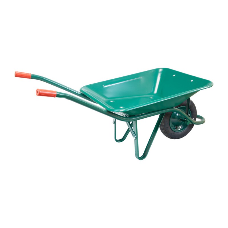 Carretilla obra verde metálica con rueda desmontada.