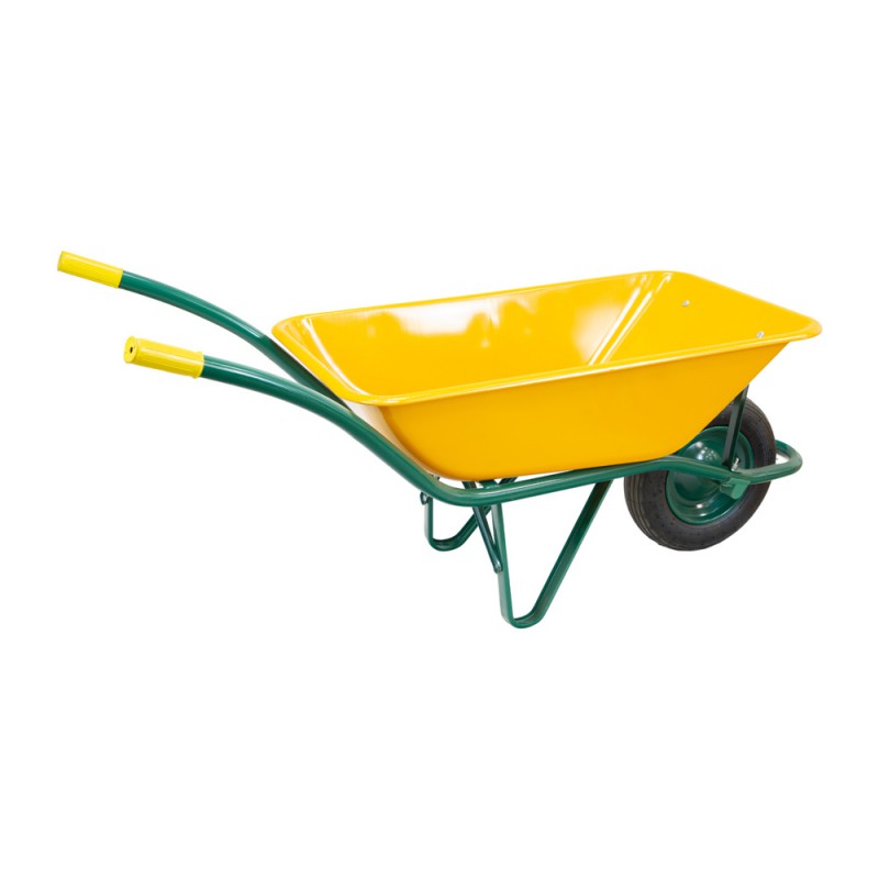 Carretilla obra amarilla metálica con rueda desmontada.