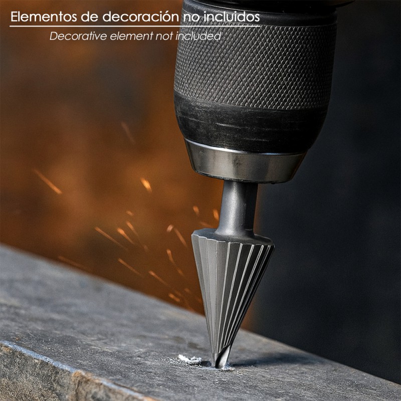 - Forma cónica ideal para agrandar orificios, biselar bordes y realizar cortes precisos en ángulo.